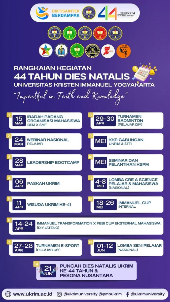 Universitas Kristen Immanuel (UKRIM) Yogyakarta menyelenggarakan rangkaian kegiatan Dies Natalis ke-44 dengan mengusung tema “Impactful in Faith and Knowledge” sebagai wujud komitmen dalam mengintegrasikan iman dan ilmu pengetahuan. Momentum Dies Natalis ini tidak hanya menjadi ajang refleksi perjalanan panjang UKRIM, tetapi juga penguat semangat sivitas akademika untuk terus berkarya dan berinovasi. Dengan mengedepankan nilai-nilai kristiani, UKRIM berupaya mencetak generasi yang tidak hanya unggul secara intelektual, tetapi juga berkarakter dan berdampak bagi masyarakat luas. Melalui tema ini, UKRIM menegaskan perannya sebagai institusi pendidikan yang siap menjawab tantangan zaman dengan landasan iman yang kokoh dan pengetahuan yang relevan.